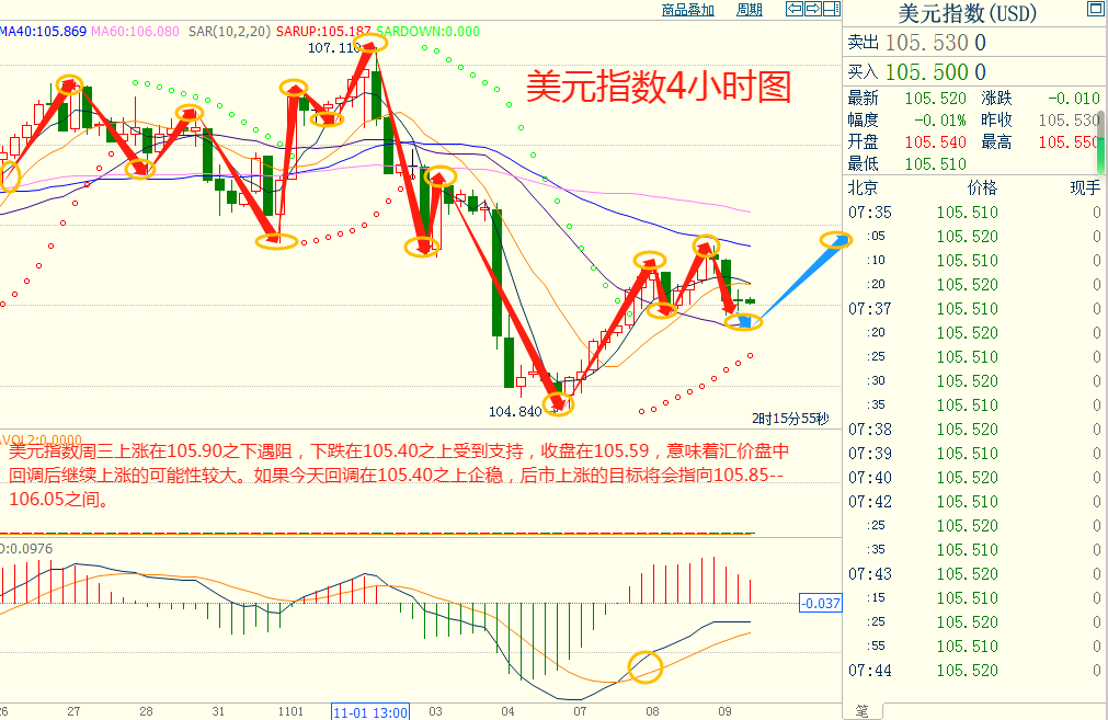 美指周三上涨在105.90之下遇阻,下跌在105.40之上受到支持,意味着美元短线下跌后有可能保持上涨的走势。如果美指今天下跌在105.40之上受到支持,后市上涨的目标将会指向105.85--106.05之间。今天美指短线阻力在105.80--105.85,短线重要阻力在106.00--106.05。今天美指短线支持在105.40--105.45,短线重要支持在105.20--105.25。