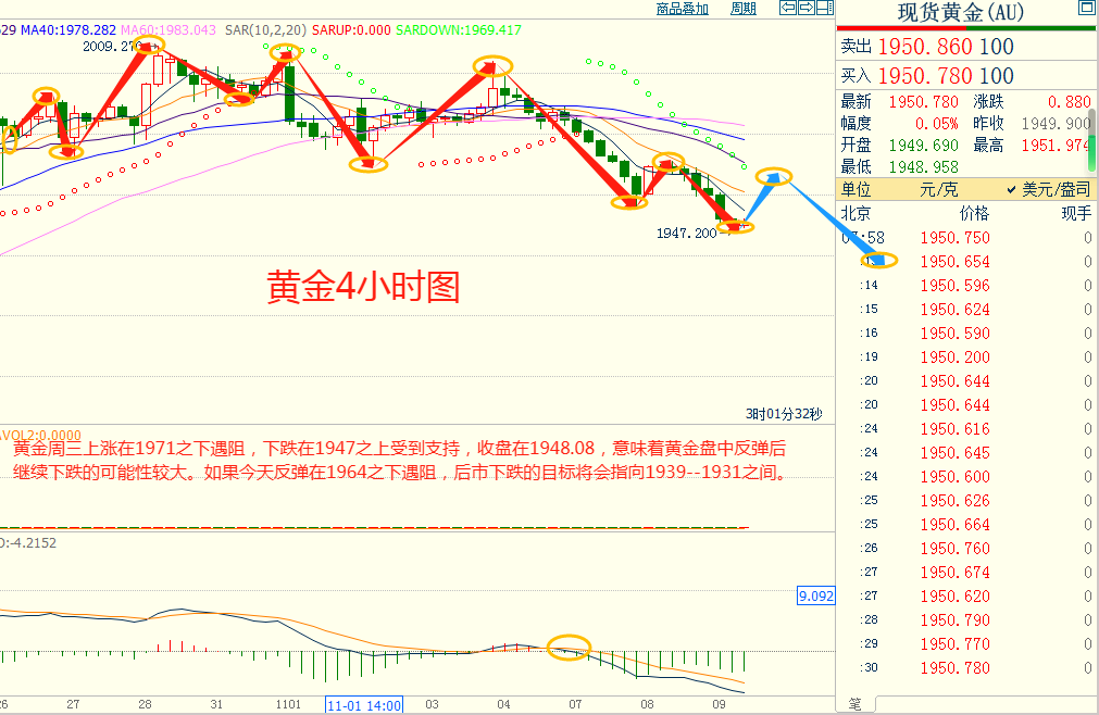 黄金周三下跌在1947.00之上受到支持,上涨在1971.00之下遇阻,意味着黄金短线上涨后有可能保持下跌的走势。如果黄金今天上涨在1964.00之下遇阻,后市下跌的目标将会指向1939.00--1931.00之间。今天黄金短线阻力在1963.00--1964.00,短线重要阻力1979.00--1980.00。今天黄金短线支持在1939.00--1940.00,短线重要支持在1931.00--1932.00。
