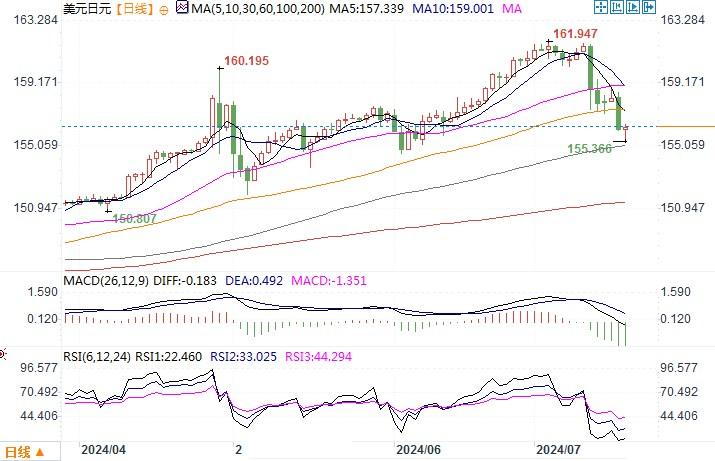 周三(7月17日),美元兑日元稍早触及156.09的6月12日以来最低,纽约盘尾收市阶段下跌0.32%报156.25。市场有传闻疑似日本央行继续在实施干预,关于这点并未得到日本方面证实。但来自日本央行周二公布的数据显示,上周五可能花费2.14万亿日元(135亿美元)进行干预,加上上周四的估计支出,日本在过去一周疑似购买近6万亿日元以进行干预。据共同社报导,日本财务省财务官神田真人周三表示,如果投机者导致汇市出现过度波动,他将不得不采取应对措施,且当局干预的频率没有限制。日本央行这种瞅准美元行将走弱时机随时可能出手的干预行为,加剧了日元的波动。此外,美联储发布的褐皮书显示,从5月底到7月初,经济活动略微至小幅扩张,企业报告称劳动力市场出现了一些持续趋软的迹象。市场对美联储更加接近降息的信心增强,这些都是周三的关键市场主题。为此周三市场上,美元兑各主要非美货币普遍出现下跌。日线图上,美元/日元经过短暂的调整,隔夜再拉出一根大阴线,汇价跌出布林带通道下轨线之外,显示美元/日元的回撤较为迅猛,下方进一步回撤将会向155-153价格区域发展。上方目前看来160构成了初步较强的阻力。