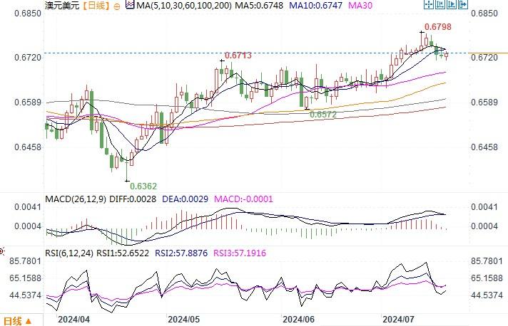 周三(7月17日),澳元兑美元持平于0.6730美元。澳元/美元在亚洲小幅走高,因美联储降息押注引发风险资产大涨,而且美国公债收益率下降给到澳元相应的支撑。 但澳元的上行空间受限,主要是疲软的中国经济数据引发需求的担忧导致大宗商品价格下降,继续打压了澳元的人气。目前市场将聚焦周四澳洲就业数据,该数据将是澳央行利率预期的关键。若就业数据呈增长势头,则会令市场对澳联储预期降息的时点更为延后,从而与美联储的利率分化更为明显。澳元或会从中得到支撑而回升。相反,若数据呈弱,澳元/美元恐怕要延续回撤的走势。从日线图上观察,前期横盘区间高点0.6705-15现为坚实支撑位;上方阻力位依次在0.6765-70、0.6800。