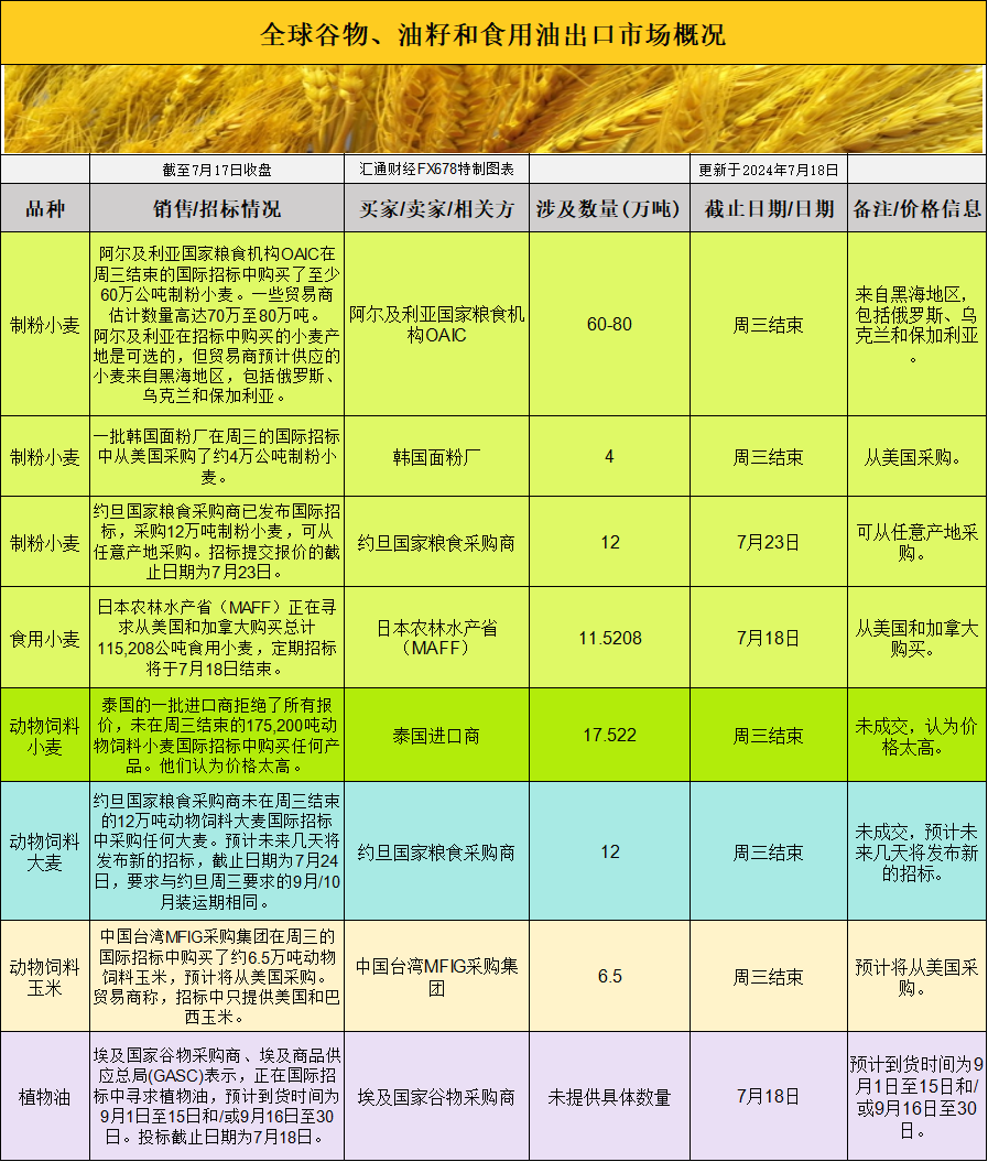 全球谷物、油籽和食用油出口市场招标、采购概况(24年7月18日):