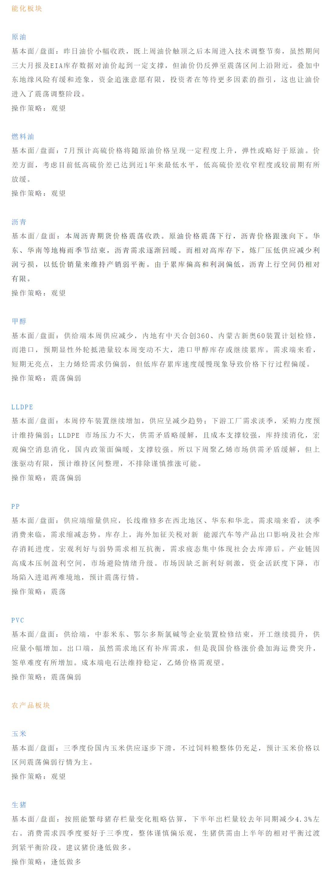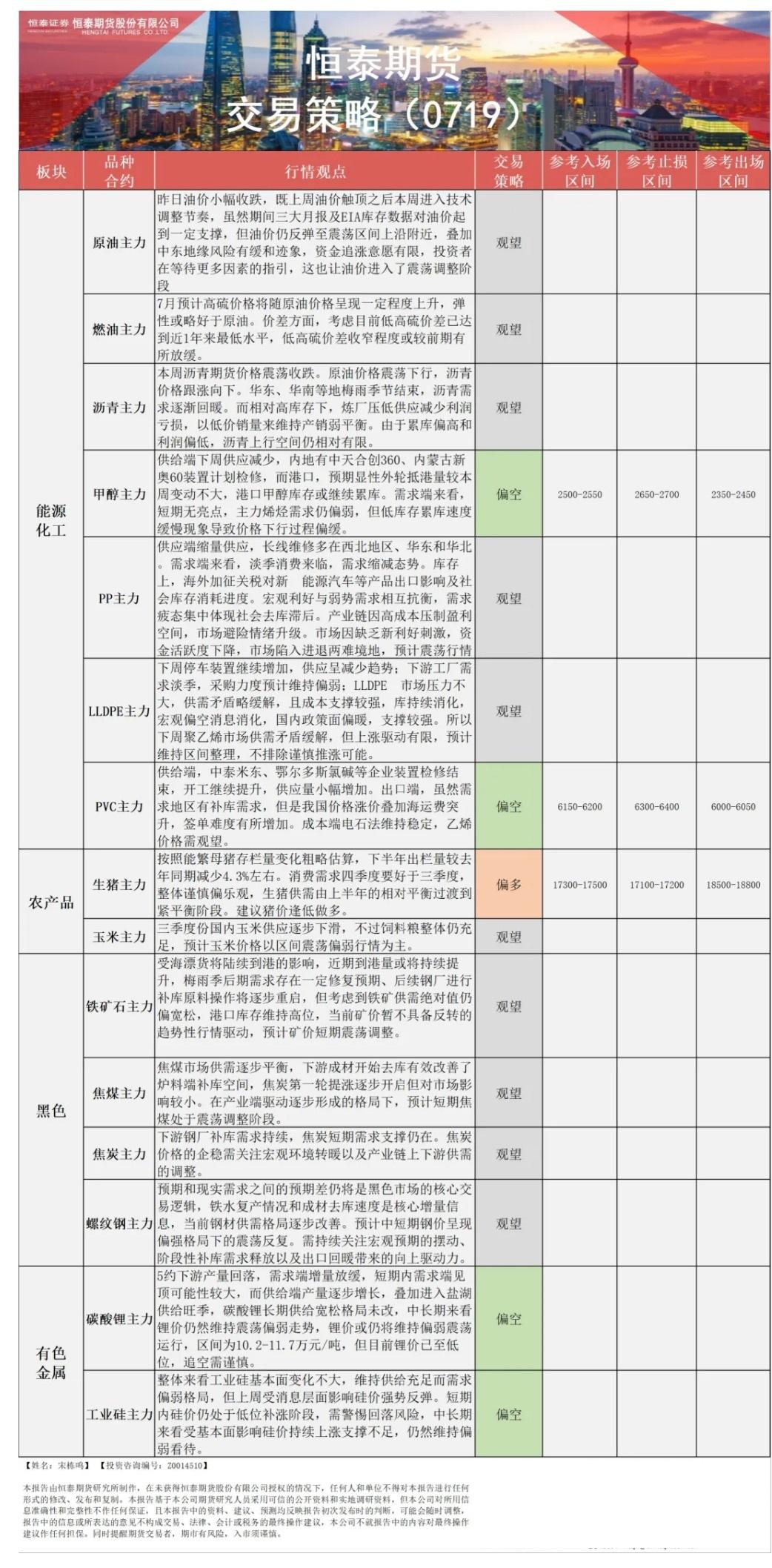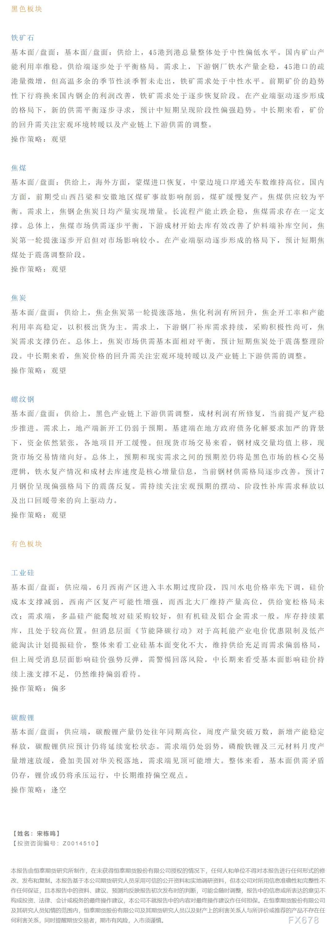 以下是恒泰期货今日早间交易策略,覆盖品种有:宏观分析、原油燃料油等能源化工、玉米生猪等农产品、黑色系如铁矿石焦煤焦炭螺纹钢、有色系如工业硅碳酸锂等。