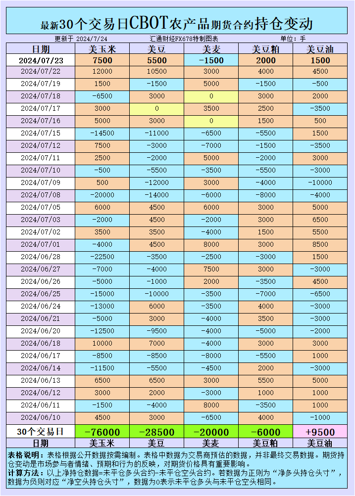 小麦市场的情况则有所不同,大宗商品基金在7月23日增加了CBOT小麦的投机性净空头,这可能反映了市场对小麦价格短期内的看跌情绪。