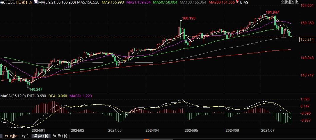 北京时间7月24日9:55,美元兑日元报155.21/23