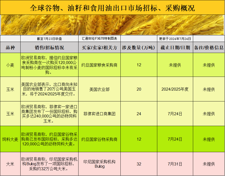 全球谷物、油籽和食用油出口市场招标、采购概况: