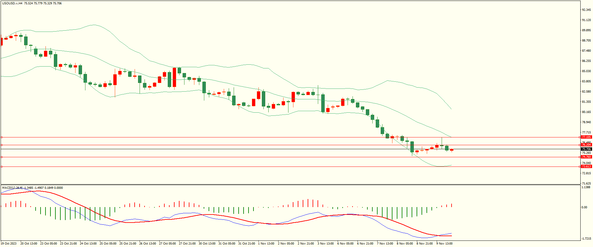 原油昨日反弹至第一阻力承压下行,尾盘时段跌势缓和,日线报收十字星线,多空争夺较为均衡,从4H来看,布林上下轨略有收窄,MACD零轴下方运行,日内上方首要阻力76.20-30,第二阻力77.10,下方支撑74.75,73.60-70,保持在第一阻力下方短线有望测试第一支撑。