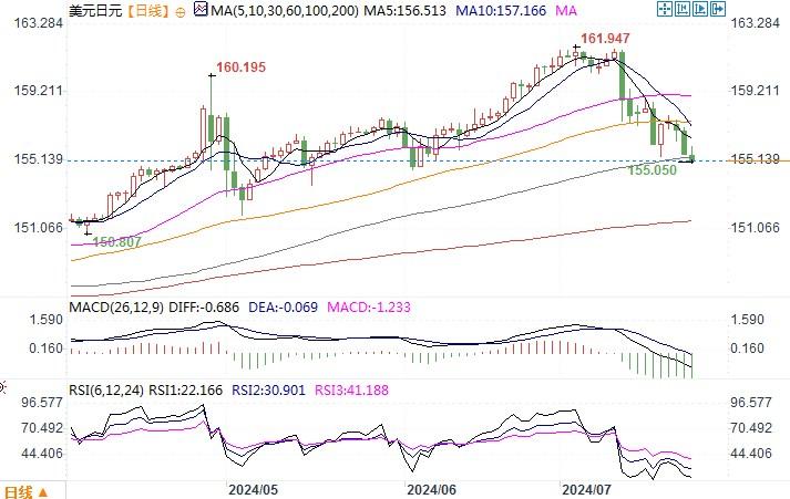 周二(7月23日),日元兑美元周二连续第二个交易日上涨,美元兑日元纽约盘尾下跌0.9%,收盘报155.62。执政自民党干事长茂木敏充表示,日本央行应更明确地表明货币政策正常化的决心,包括稳步加息。日本央行下一次公布利率决定的时间是7月31日。接受路透调查的大多数经济学家预计,日本央行将在此次会议上按兵不动。显然,市场正在为日本央行的决定做准备,日元近期的回升表现有点投机性押注做空美元的味道。周二来自美国的数据显示,美国6月成屋销售下降5.4%,经季节调整后的年率为389万户,为12月以来的最低水平。与此同时,成屋价格中位数较上年同期急升4.1%,创下42.69万美元的纪录新高,为连续第二个月创新高。但美元显然对数据的反应不大。受日元利率有望进一步提升的预期影响,日元兑其它主要货币的套利平仓交易渐渐展开,这对日元形成一定的支撑。日线图上,美元/日元继续沿布林带通道下轨线下行,技术指标保持下倾,显示美元/日元的回撤行情在延续之中。下方留意155.00水平的支撑,一旦跌穿,回撤幅度将进一步拓深。上方若是重回到160之上,那么日元的弱势或将会继续着。