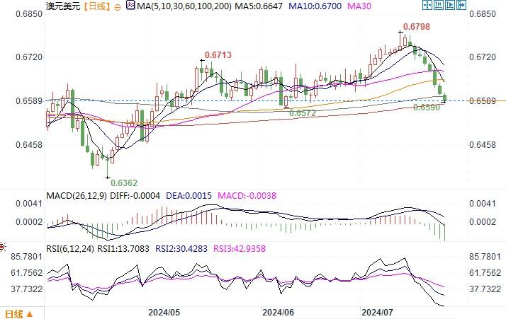 周二(7月23日),澳元兑美元跌至三周低位0.6612美元。受套利交易平仓日元走强的影响,澳元/日元交叉盘中走弱,间接拖累澳元/美元的表现,使得澳元近期的下行之势不断延续着。而且近期大宗商品价格的不断下滑,继续不利于澳元。此外,澳联储8月加息的概率不高,使得之前被认为有利差优势的支撑开始遭到削弱。本周三开始,美国还将有一系列重磅经济数据公布,数据的强弱预料也会对澳元造成一定的影响。日线图上,澳元/美元跌至布林带通道下轨线,技术指标严重下倾,显示澳元抛压沉重。短线存在超卖,目前就看此前横盘波动区间的下沿0.66能否给与较坚实的支撑。一旦失守,澳元弱势将会延续。