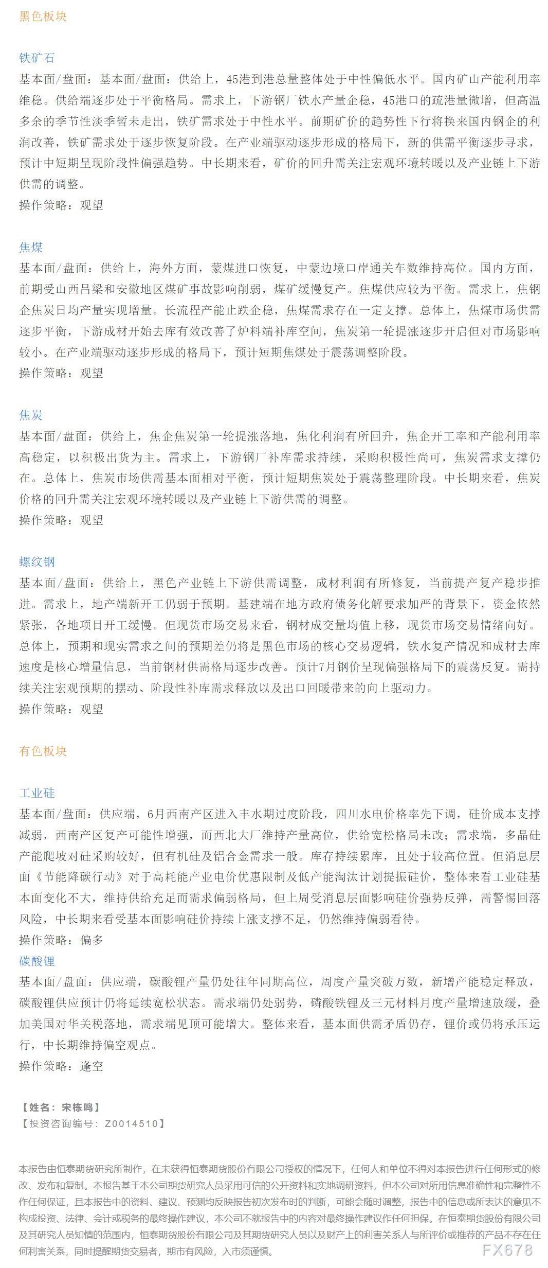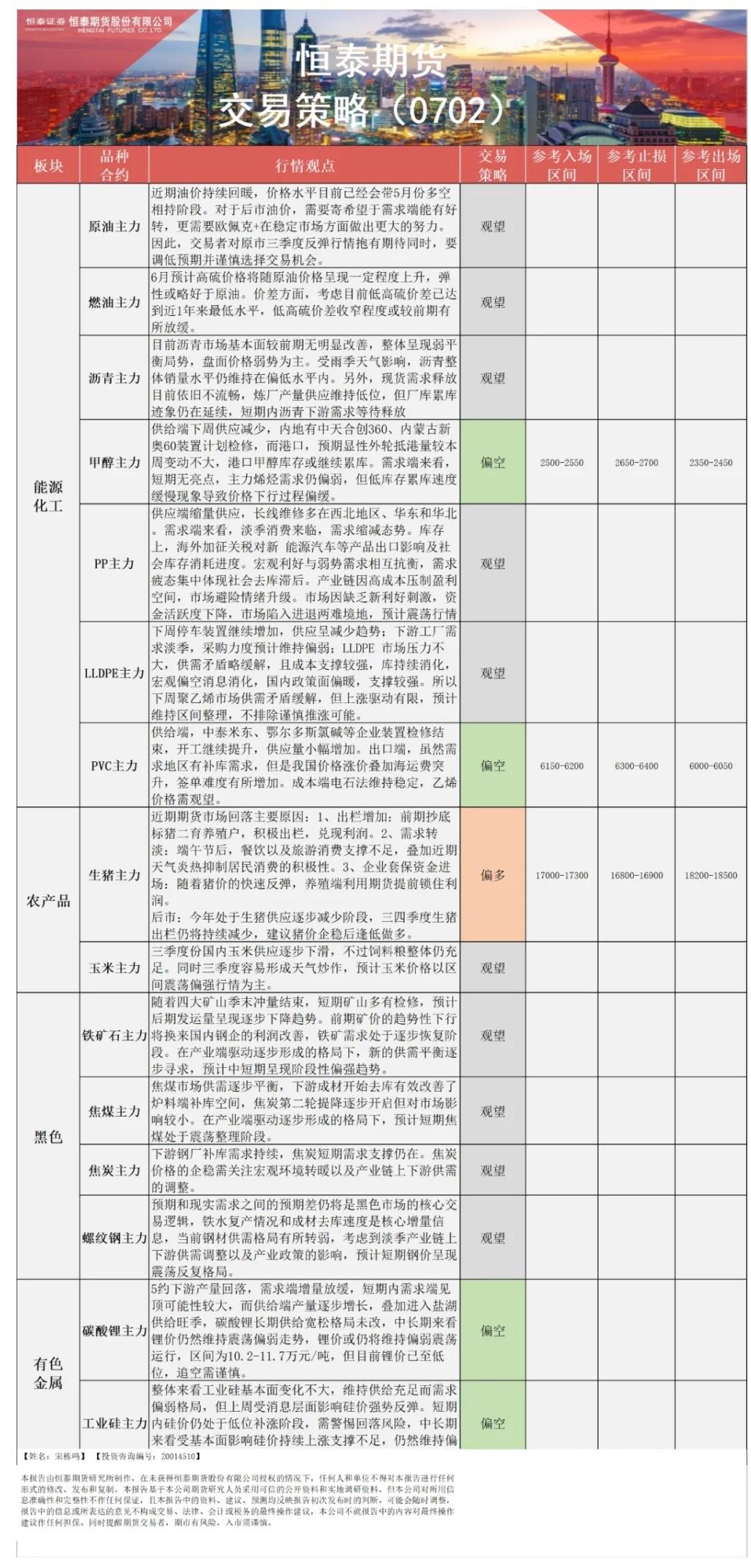 以下是恒泰期货今日早间交易策略,覆盖品种有:原油燃料油等能源化工、玉米生猪等农产品、黑色系如铁矿石焦煤焦炭螺纹钢、有色系如工业硅碳酸锂等。