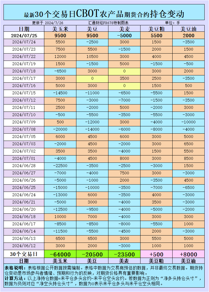 增加CBOT玉米投机性净多头;增加CBOT大豆投机性净多头;增加CBOT小麦投机性净空头;增加CBOT豆粕投机性净多头;增加CBOT豆油投机性净多头。