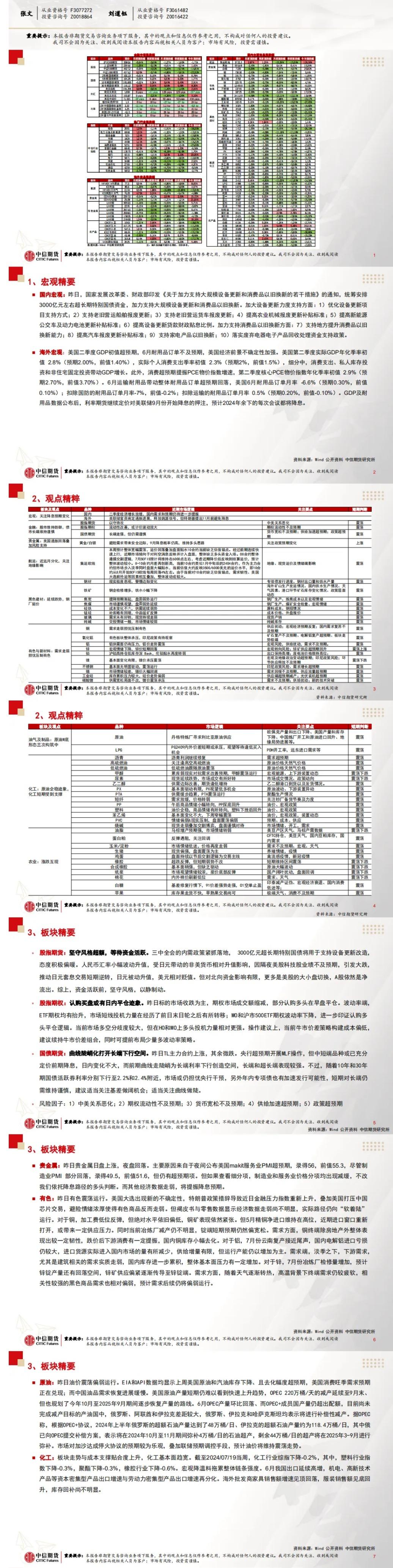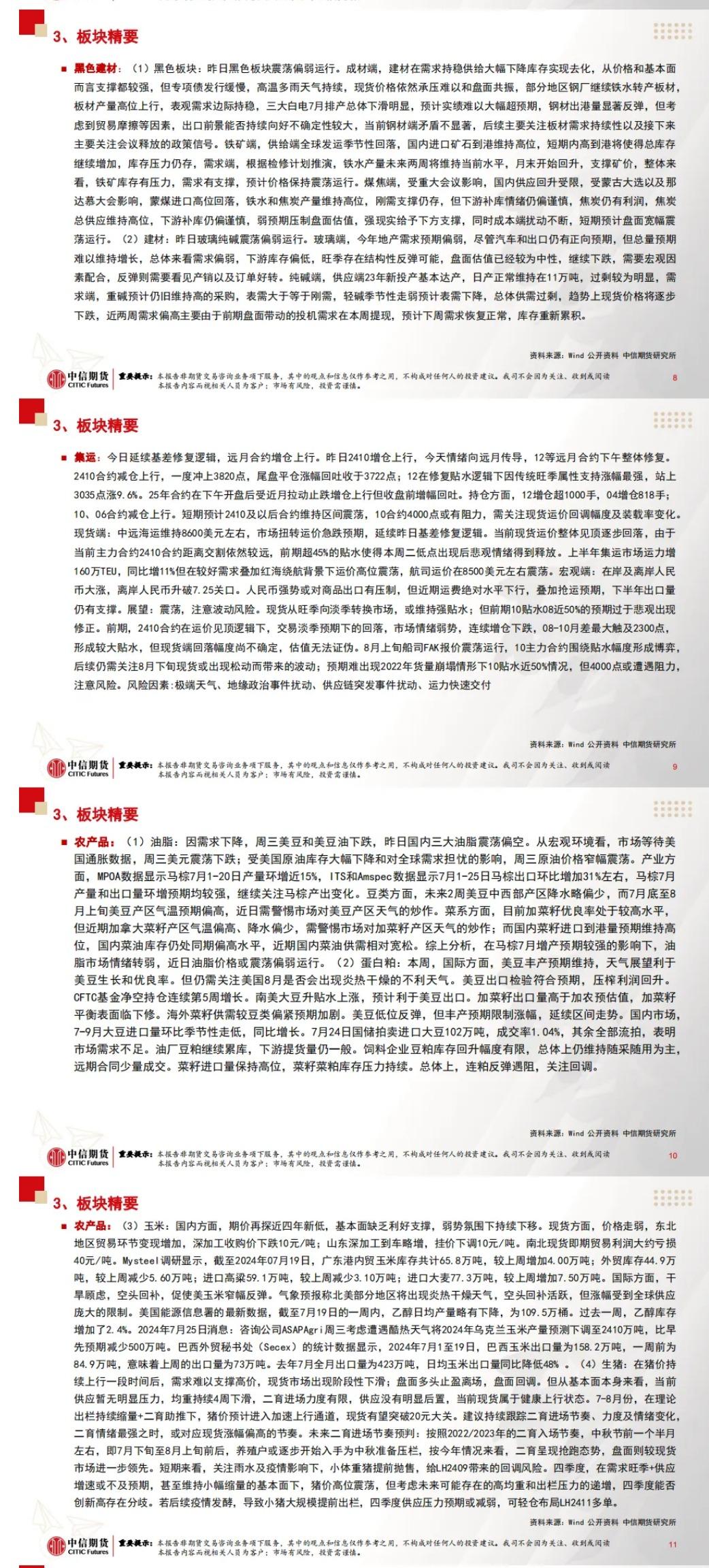 以下为中信期货今日晨报对股指、国债、贵金属、原油能源化工、有色金属、螺纹钢材焦炭黑色系玻璃纯碱等建材、玉米生猪油脂蛋白粕等农产品等期货的操作建议和提醒。