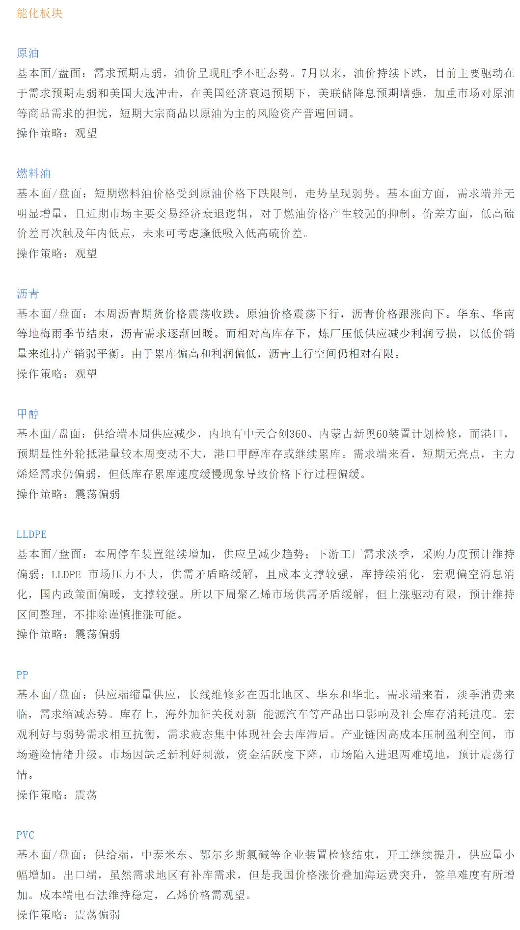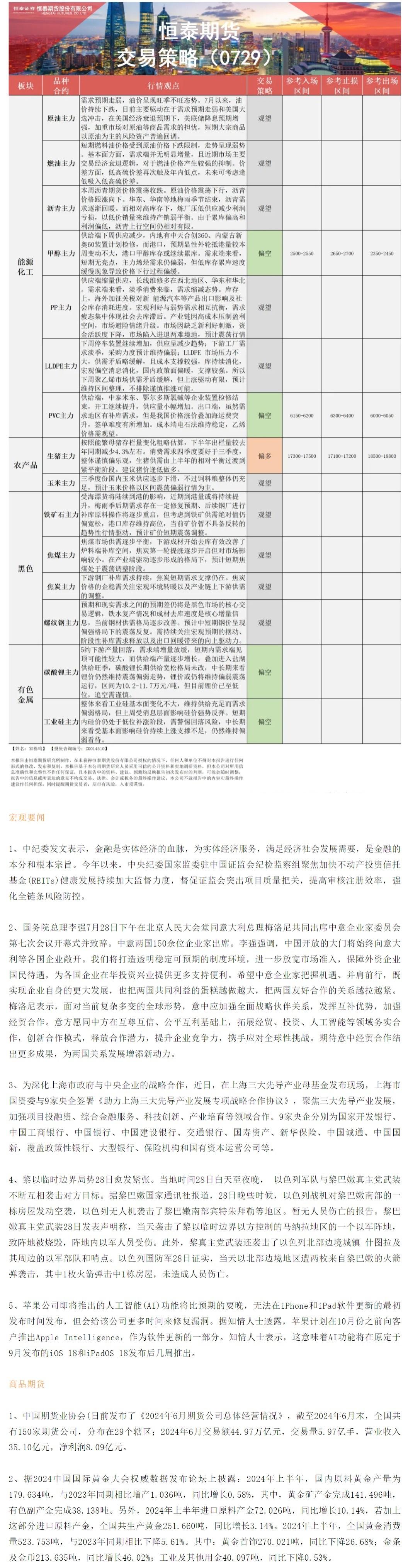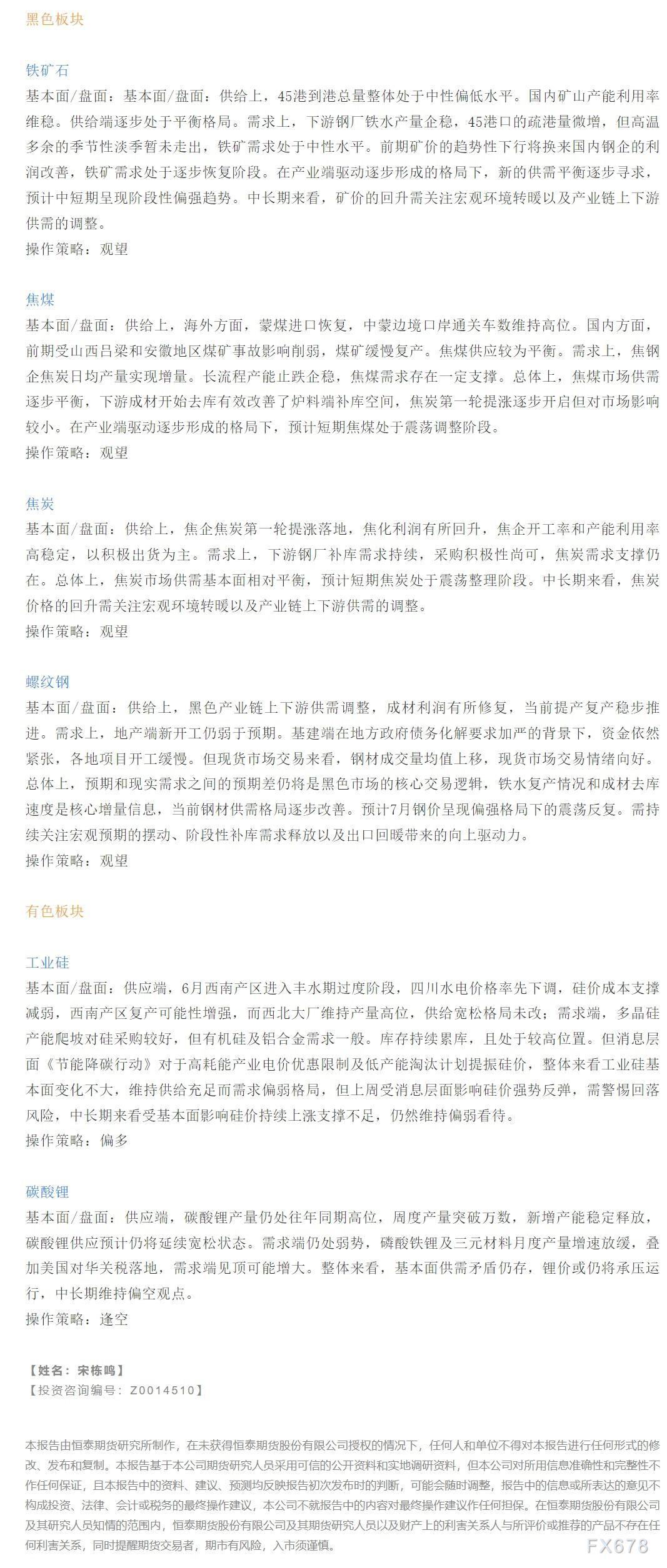 以下是恒泰期货今日早间交易策略,覆盖品种有:宏观分析、原油燃料油等能源化工、玉米生猪等农产品、黑色系如铁矿石焦煤焦炭螺纹钢、有色系如工业硅碳酸锂等。