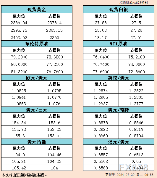 本文提供黄金、原油、美元指数、欧元、英镑、日元、瑞郎、澳元支撑阻力位。