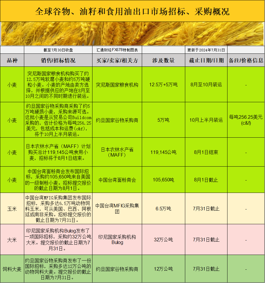 全球谷物、油籽和食用油出口市场招标、采购概况: