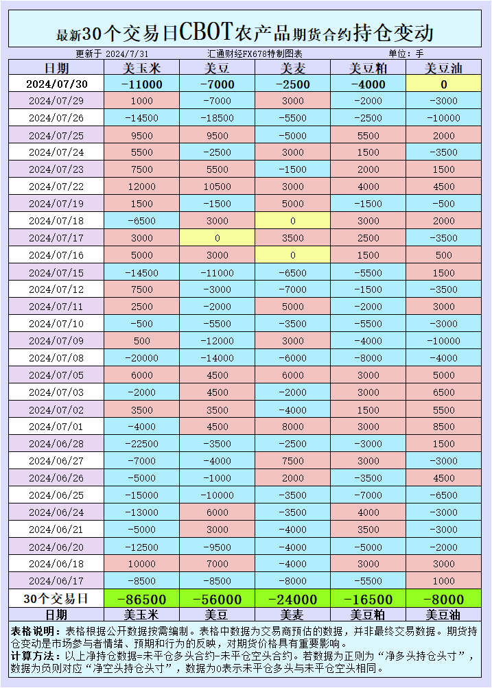 增加CBOT玉米投机性净空头;增加CBOT大豆投机性净空头;增加CBOT小麦投机性净空头;增加CBOT豆粕投机性净空头;CBOT豆油未平仓多头与未平仓空头相同。