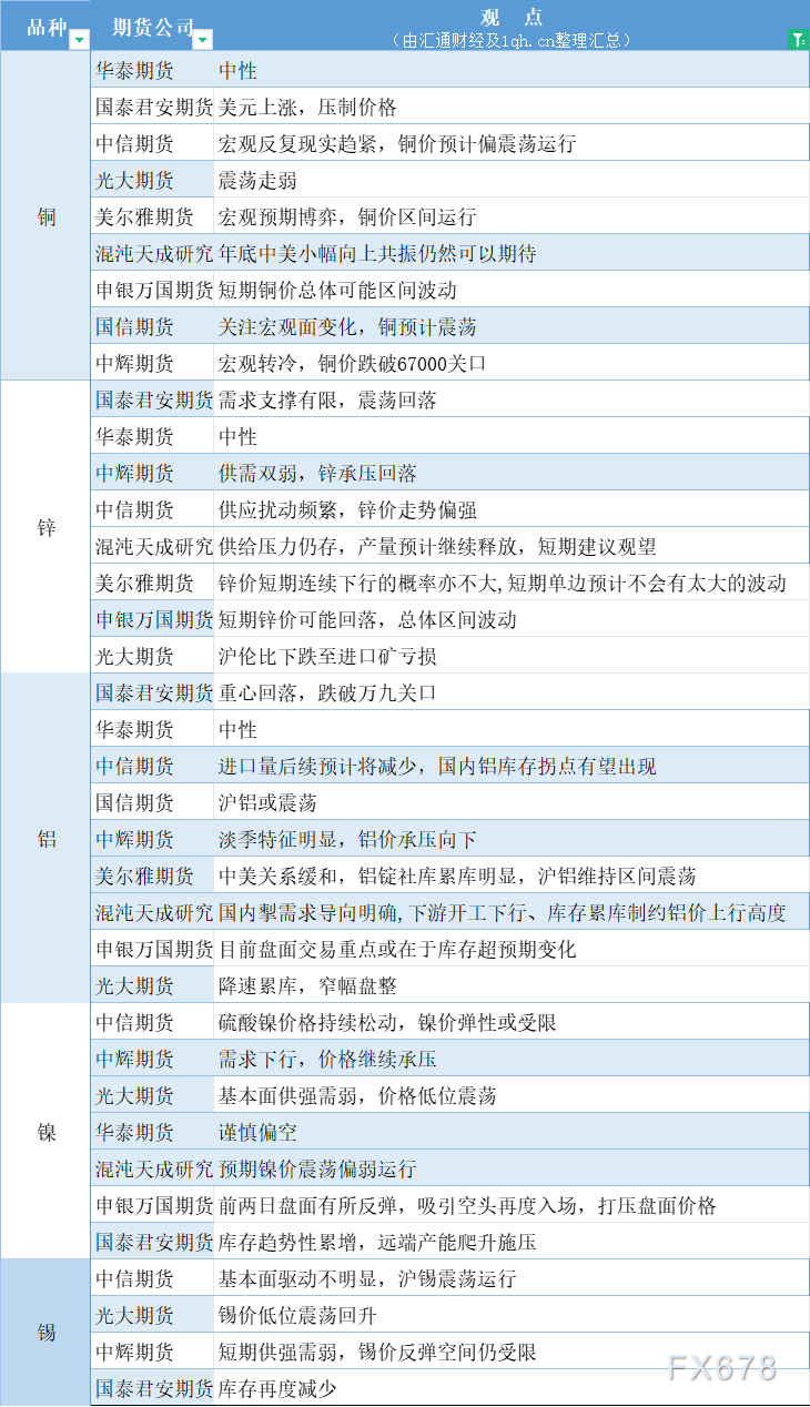 期货公司观点汇总一张图:11月13日有色系(铜、锌、铝、镍、锡等)