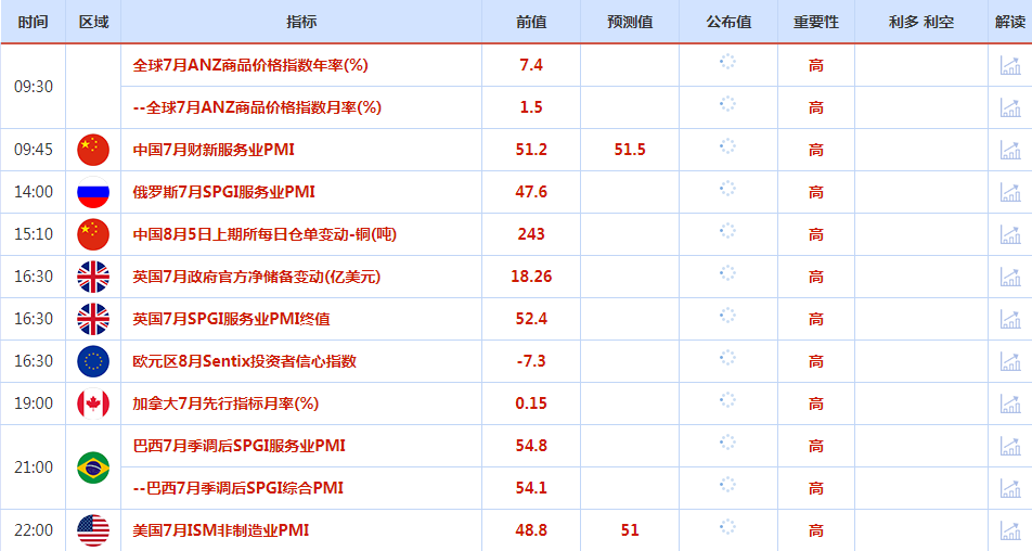本周经济数据相对较少,本交易日重点关注美国7月ISM非制造业PMI数据,市场预期比较乐观,短线可能会令金价面临进一步回调风险。