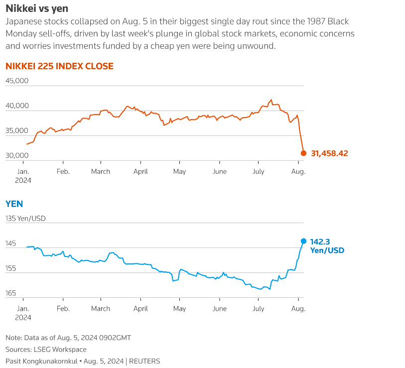 (日经 225 指数收盘价和 2024 年 1 月以来的日元/美元水平 图源:路透社)