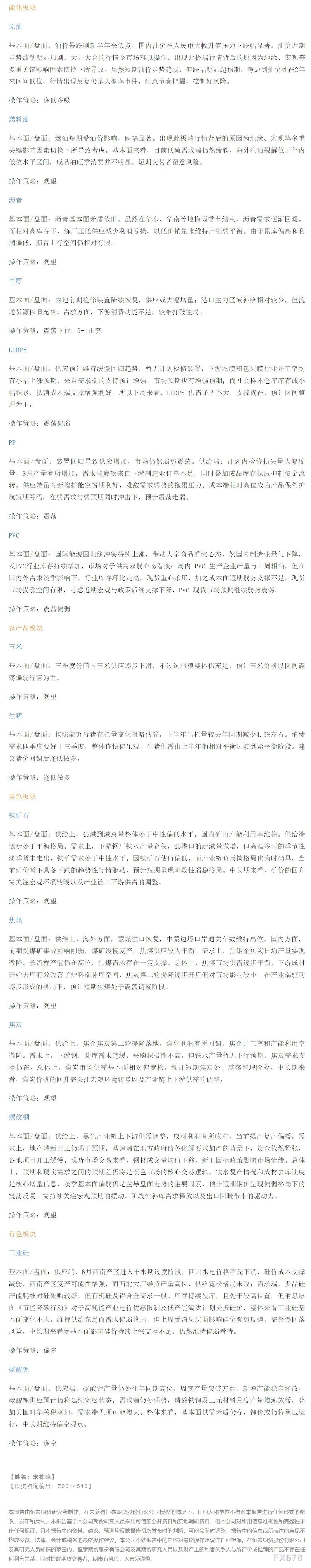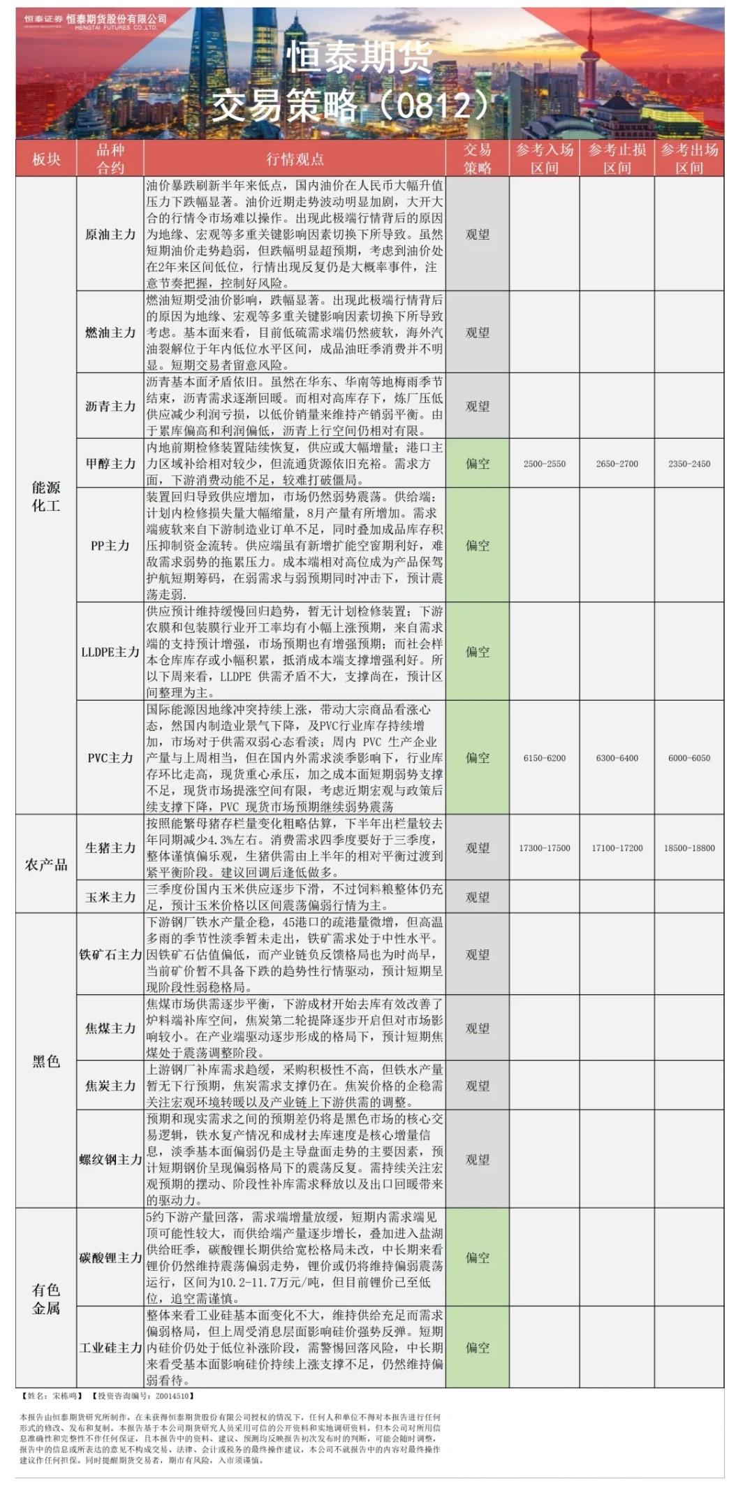 以下是恒泰期货今日早间交易策略,覆盖品种有:宏观分析、原油燃料油等能源化工、玉米生猪等农产品、黑色系如铁矿石焦煤焦炭螺纹钢、有色系如工业硅碳酸锂等。