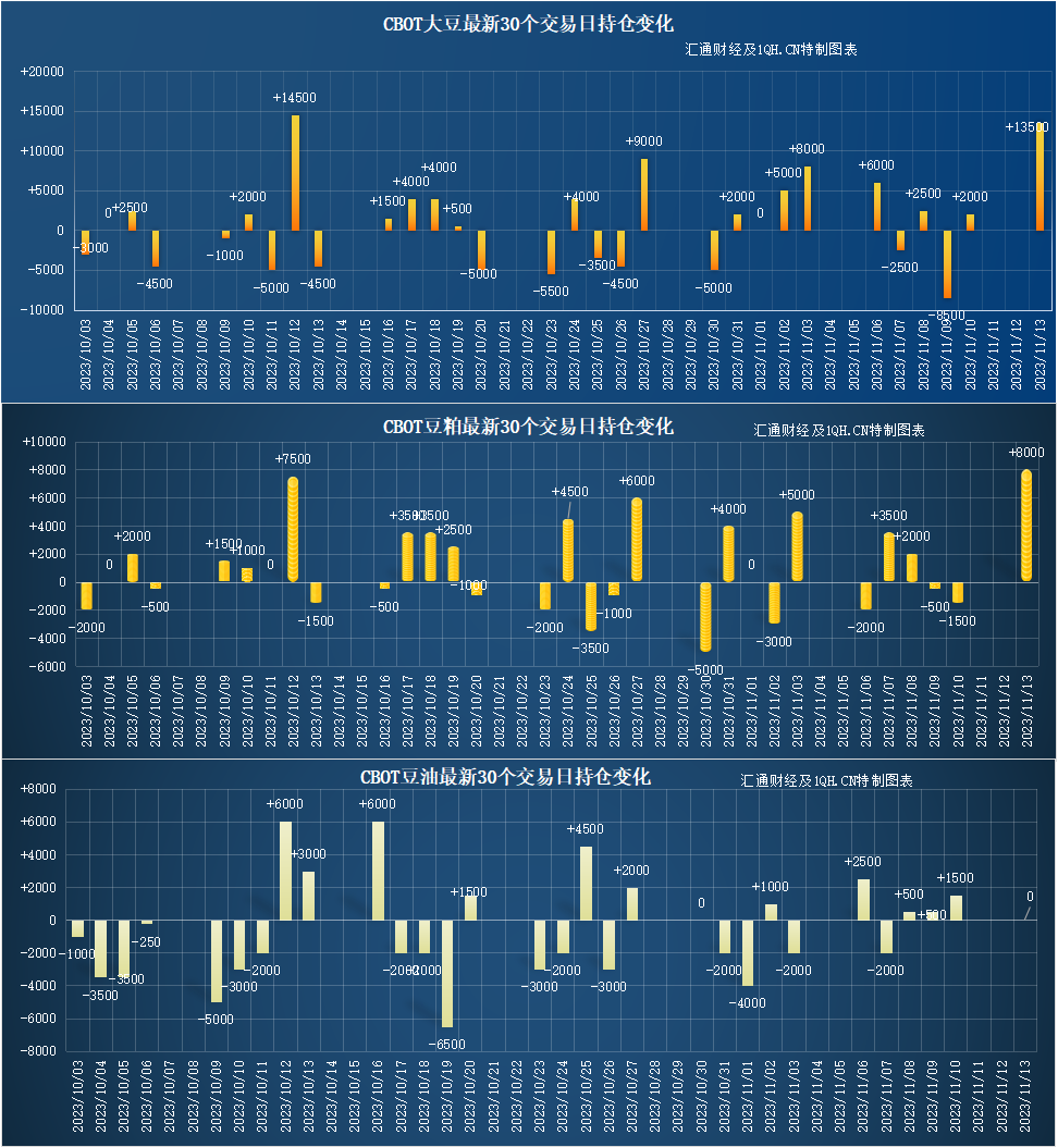 交易商估算的结果显示,大宗商品基金本周一(11月13日)增加玉米、大豆、小麦、豆粕投机性净多头头寸,豆油未平仓多头与未平仓空头相同。最近30个交易日,大宗商品基金本增加玉米、豆油、小麦投机性净空头头寸,增加豆粕、大豆投机性净多头头寸。