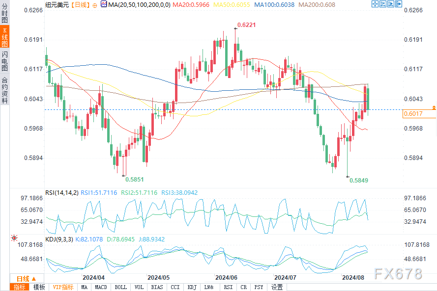 周三(8月14日),新西兰联储将官方隔夜拆款利率(OCR)下调0.25个百分点,这是自2020年初以来的首次放宽政策,比其自身的预期提前一年,之后新西兰元/美元一度重挫1.2%,最新下跌1.1%至0.60060美元。