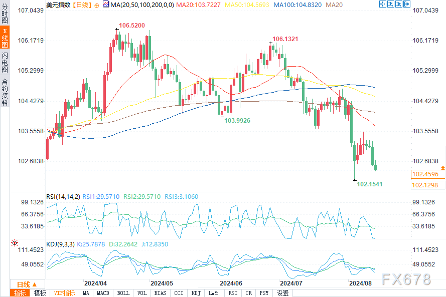 衡量美元/其他主要货币汇率的美元指数盘中下跌0.15%,至 102.4572。美元指数周二下跌了 0.5%,原因是生产者物价指数(PPI)升幅慢于预期,增强了美国下月降息的希望。