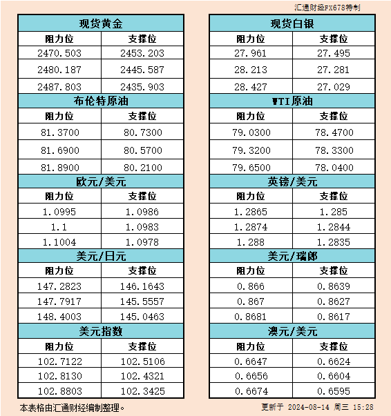 8月14日欧市黄金、白银、原油、美元指数、欧元、英镑、日元、瑞郎、澳元支撑阻力位一览。