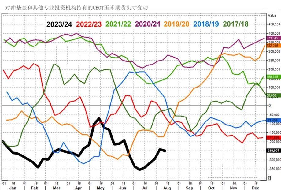 最后,让我们转向玉米市场。资金管理者在CBOT玉米期货和期权的净空头头寸从一周前的242,545增加到249,007,结束了连续四周的空头回补。这是基金在8月中旬对玉米最看跌的立场,尽管较7月9日的历史最高空头头寸353,983份合约有所下降。此外,超过13,000份净玉米多头头寸在最近一周被增加,这可能是一些投资者认为期货价格可能接近短期低点的信号。然而,美国的玉米期末库存比上个月的预测下降了1%,2024-25年度美国的玉米结转库存仍将是六年来的最高水平。