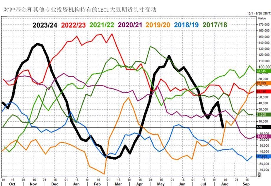 尽管基本面上出现了一些积极信号,例如大豆种植面积的增加和创纪录的产量,但市场似乎更关注于库存的增长。此外,12月大豆期货在8月13日当周下跌了6.3%,随后三个交易日又下跌了0.6%,价格触及每蒲式耳9.55美元的四年低点。这表明市场对于大豆价格的短期前景持悲观态度。