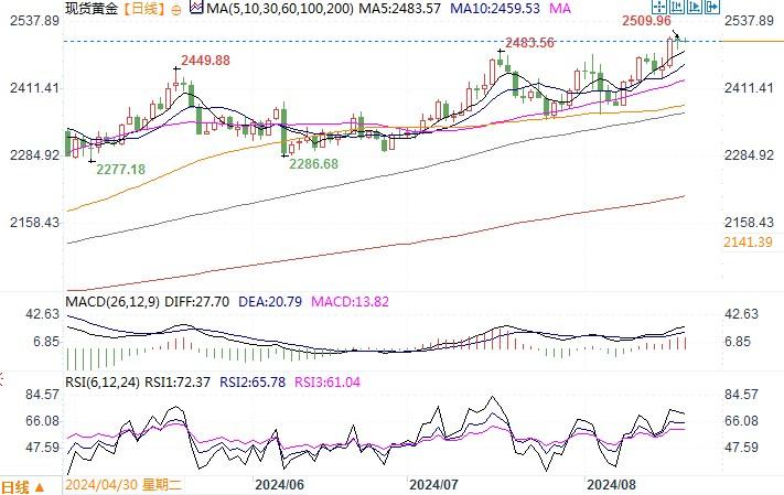 技术层面上,国际黄金周一经震荡整理之后维持于历史高位附近,日线录得下影线较长小幅阴线。日线级别图上,金价虽反弹动力减弱,走势一度回撤,但之前突破的2480美元一线的3顶阻力,已转为强劲支撑,因而昨日在临近此支撑附近时,市场产生了买盘入场,虽仍面临回调需求,但整体日线移动平均线维持较为规整向上发散排列,技术指标MACD上扬态势开始加强,显示多头排列良好。近期对于黄金的走势,下方关注2497美元附近以及2488美元附近支撑;上方关注2510以及2518美元附近阻力。
