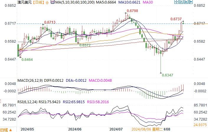 周一(8月19日),澳元兑美元继续强劲上行,收盘阶段上涨0.95%报0.6729美元,最高触及0.6732美元的7月18日以来最高。美国零售销售强劲和通胀降温导致风险偏好回升,投资者押注这个全球最大经济体将避免衰退,美联储将在9月份降息。目前投资者预计美联储主席鲍威尔周五在杰克森霍尔会议很可能在货币政策上有鸽派的表态,这股预期提振了澳元。此外,澳大利亚央行于周二公布其8月份政策会议的纪要,澳洲联邦银行(CBA)国际经济主管Joseph Capurso表示:“如果澳洲央行的会议纪要被认为是鹰派的,或FOMC主席鲍威尔的讲话被解读是鸽派的,那么澳元/美元本周大部分时间可能会高于我们的季度末预测值0.6700。”日线图上,布林带喇叭口扩张之中,澳元/美元汇价冲向布林带上轨线之外,技术指标保持明显的上挺趋向,显示澳元此轮反弹动能强劲。但短线超卖较重,须提防获利回吐调整风险。此前阻力位所在0.67变支撑后是首个支撑位所在,随之在0.6660。上方若进一步发展,首要目标将瞄向0.6800。