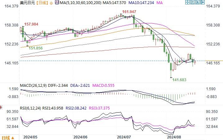 周一(8月19日),美元兑日元收盘报146.66 ,下跌0.62%,盘中一度触及145.20的8月7日以来最低。由于市场乐观地认为美日之间的利率差距将继续缩小,以及美元/日元利差交易仍持续平仓,日元经过一番调整之后仍表现上涨。日本央行总裁植田和男将于周五出席国会会议,预计他将讨论央行上个月的加息决定。路透对18位经济学家的调查显示,日本7月消费者通胀可能连续第三个月上涨,这将让日本央行在上个月将短期利率上调至0.25%之后,继续考虑再次加息。而且有统计数据显示,自2021年以来的日元空头押注已开始转变为净多头押注在增加。此外,交易员等待美联储主席鲍威尔(Jerome Powell)本周的发言,市场普遍预计他将发出于9月开始降息的信号。美元指数也是因降息预期氛围浓厚近期连连下行。现在需要注意的是,如果本周五鲍威尔在杰克森霍尔会议上仍然对降息不给出任何细节,那么日元若想重返升势,预料波折不少。在周五之前,应以区间震荡的角度看待日元的走势表现,短期美元/日元波动的区间主要留意145-150之间。
