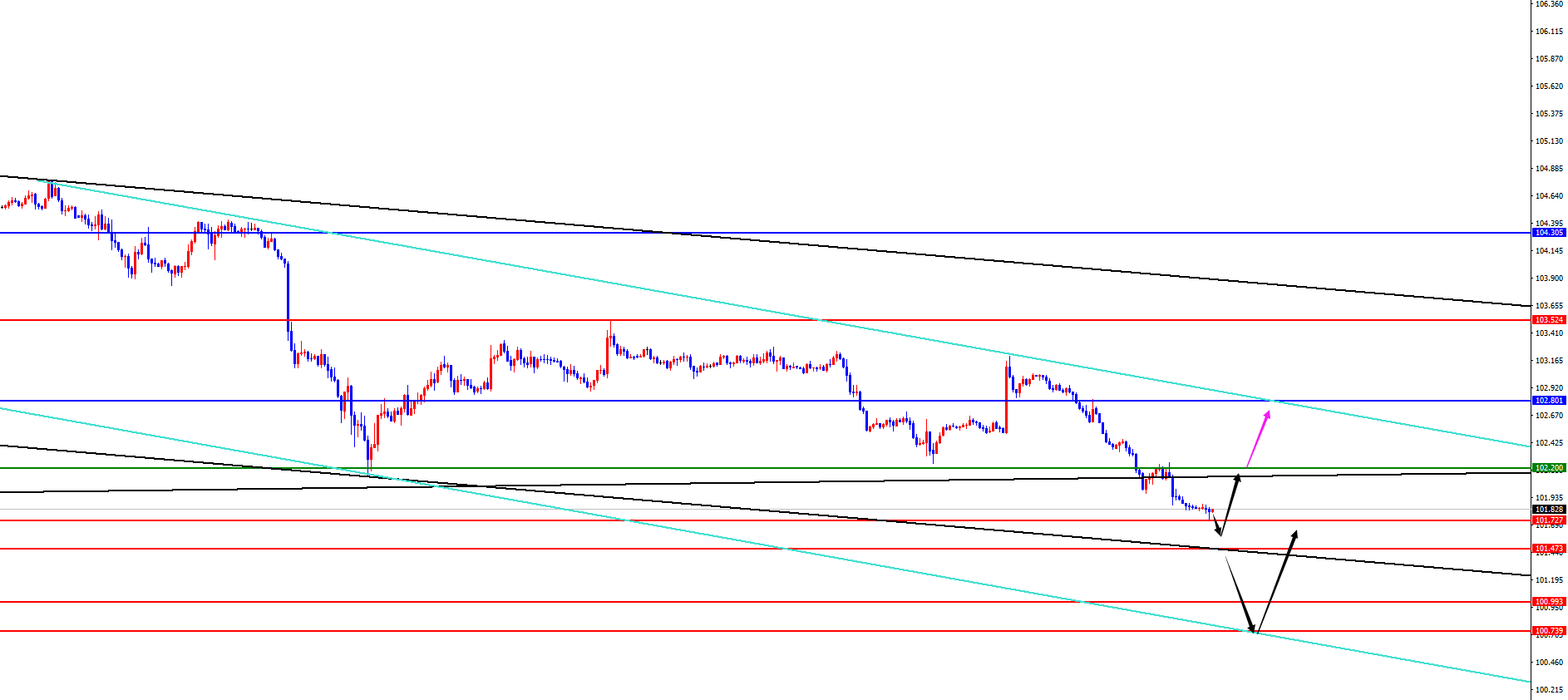 美指关注101.40-50区间得失,不破出现反K信号多,下破则等待100.70-101区间多,上方102.20位置作为短线多空分水岭