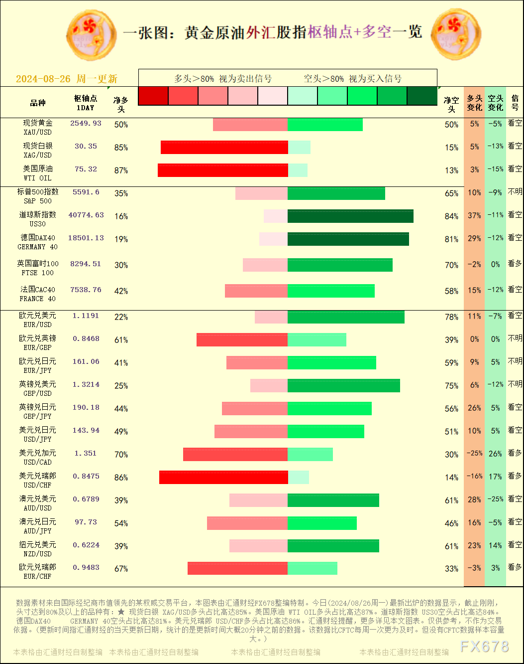 一张图:黄金原油外汇股指"枢纽点+多空占比"一览。今日(2024/08/26周一)最新出炉的数据显示,截止刚刚,头寸达到80%及以上的品种有:★ 现货白银 XAG/USD多头占比高达85%。美国原油 WTI OIL多头占比高达87%。道琼斯指数 US30空头占比高达84%。德国DAX40 GERMANY 40空头占比高达81%。美元兑瑞郎 USD/CHF多头占比高达86%。汇通财经提醒,更多详见本文图表。仅供参考,不作为交易依据。