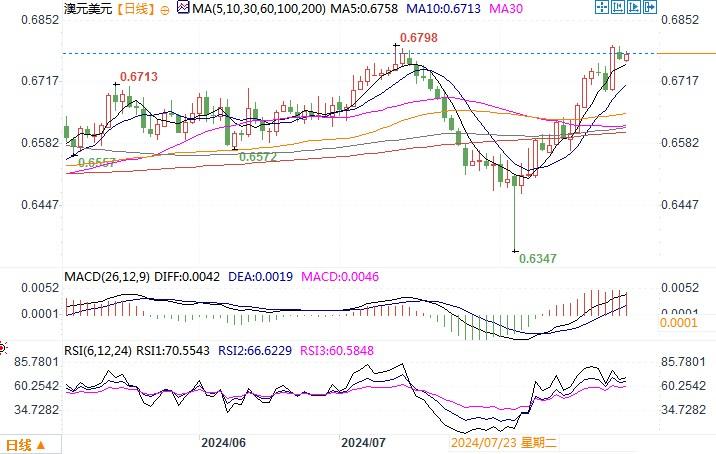 周一(8月26日),澳元兑美元周一收盘下跌0.38%,收盘于0.6771。但整体汇价还是维持在近期的高位区域内。中东紧张局势引发的避险情绪和美债收益率小幅走高构成压力。而且美联储9月降息25个基点的预期已被消化,交易员对追涨澳元有点犹豫不决。本周三公布的澳洲7月消费者物价指数(CPI)、周五公布的美国核心个人消费支出(PCE)物价指数是影响汇率走向的关键。日线图上,若上方能突破0.6800 后将测试0.6819,即2023年0.7158-0.6271跌势的61.8%回档位,若此处遇阻,则需当心出现阶段性的调整回落风险。下方支撑位分别在0.6745-50、0.6720-0.6690。