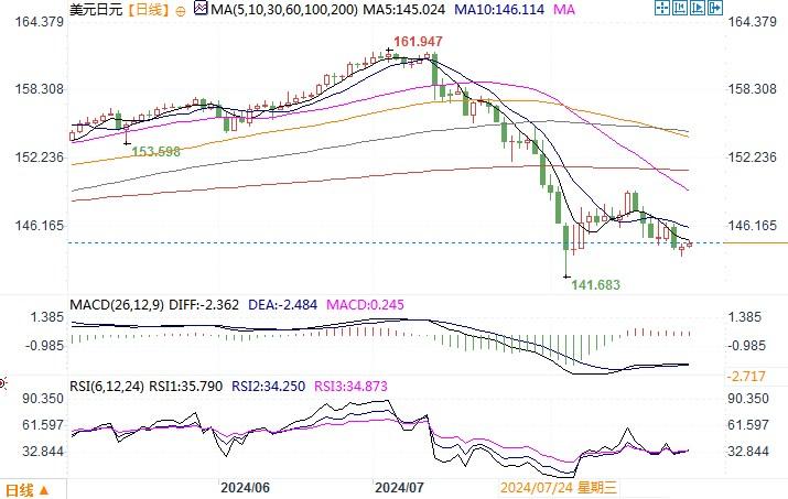 周一(8月26日),美元兑日元收盘持平于144.51,此前曾跌至三周低点143.45。以色列和黎巴嫩地缘冲突局势紧张,催生一定的美元避险买盘,令美元稍稍稳住了因鲍威尔上周表态坐实9月降息所带来的下跌。周一公布的数据显示,7月美国耐久财订单大幅增加9.9%,6月为下降。数据公布后,美元兑日元小幅回升。然而,市场上仍在消化鲍威尔上周有关降息表态的内容。从某种程度上看,鲍威尔的讲话听上去确实相当危言耸听,尤其是他围绕就业报告发表的评论。他的评论中没有任何关于缓慢、渐进降息的内容。他似乎是在发表一封公开信,表示如果数据允许,美联储将有可能大幅度、快速降息。现在就看8月份的就业数据表现如何。如果数据继续显示就业市场的紧张程度在大幅缓解之中,市场将会提高9月降息可能会从防御性的25个基点提升为50个基点的预期,并引发美国经济是否会陷入硬着陆的猜疑。美元将会因此继续走弱。日线图上,经过一周多时间的重新回落,美元/日元出现超卖情况较重,技术指标在超卖区域有所钝化,短期或面临窄幅调整的交易阶段。短期内下方143附近的支撑较强,在没有重大消息的刺激下,怕是不易跌穿。上方的阻力现阶段分别落在146.60和148.00。