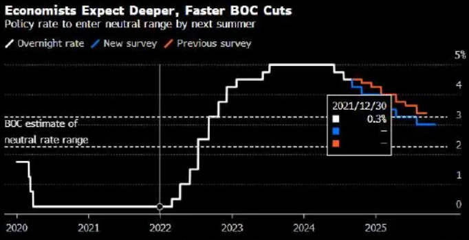 调查结果显示,分析师的预期与市场预期一致,即逐步恢复宽松的货币政策。隔夜掉期交易员也押注,到明年夏季,加拿大央行行长麦克勒姆将推出逾150个基点的宽松政策。这将使央行的政策立场更接近所谓的中性利率,即借贷成本既不刺激也不限制经济增长。