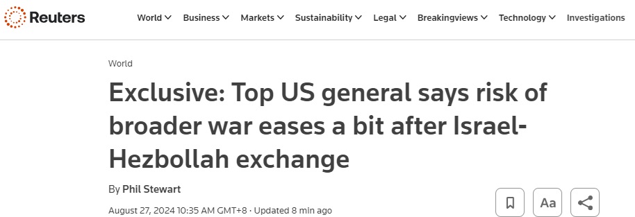 周二发布最新报道称,美国高级将领周一表示,在以色列和黎巴嫩真主党交火后,中东爆发更广泛战争的短期风险有所缓解。
