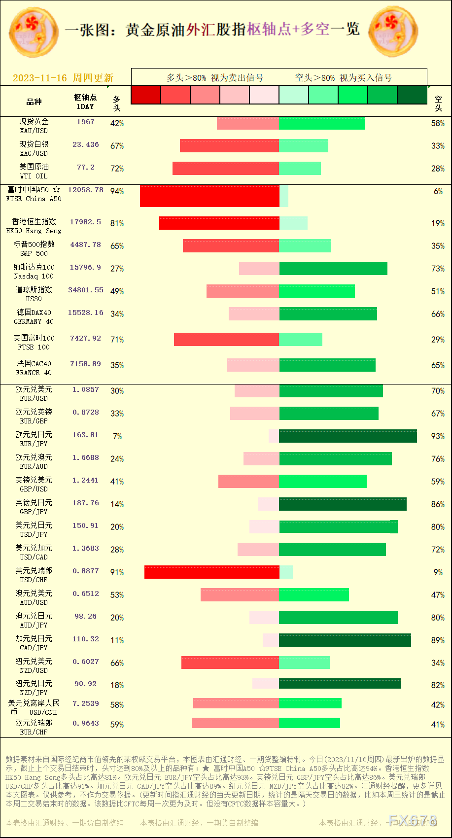 一张图:黄金原油外汇股指"枢纽点+多空占比"一览。今日(2023/11/16周四)最新出炉的数据显示,截止上个交易日结束时,头寸达到80%及以上的品种有:★ 富时中国A50 ☆FTSE China A50多头占比高达94%。香港恒生指数 HK50 Hang Seng多头占比高达81%。欧元兑日元 EUR/JPY空头占比高达93%。英镑兑日元 GBP/JPY空头占比高达86%。美元兑瑞郎 USD/CHF多头占比高达91%。加元兑日元 CAD/JPY空头占比高达89%。纽元兑日元 NZD/JPY空头占比高达82%。汇通财经提醒,更多详见本文图表。仅供参考,不作为交易依据。
