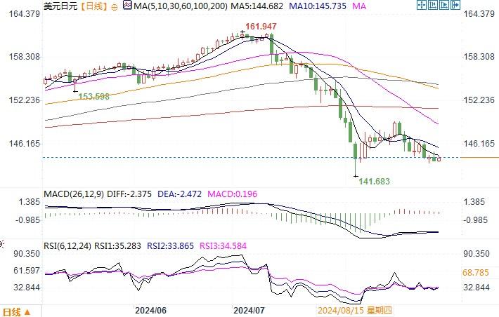 周二(8月27日),美元指数下跌0.3%,报100.53 ,盘中曾跌至去年7月以来最低。美元兑日元隔夜跌落144.00之下,收盘于143.95。数据显示美国房价6月环比下跌0.1%后,6月房价同比上涨5.1%,为2023年7月以来最小同比涨幅。受该数据影响,美元走低。周二的另一份报告显示,8月美国消费者信心有所上升。世企研的消费者信心指数升至103.3,7月数据上修至101.9。不过,市场对此数据反应不大。投资者正在等待第二季度国内生产总值(GDP)初值、初请失业金以及美联储首选的通胀指标个人消费支出(PCE)物价指数等数据出炉。若上述数据不能给出惊人的增长情况,那么美元利率下降的场景将会继续在外汇市场上进一步发酵,从而影响美元将受压延续着跌势。在上述美国重要数据公布前,美元/日元预料将保持着窄幅的僵持走势状态。波动区间主要限于143-146之间。