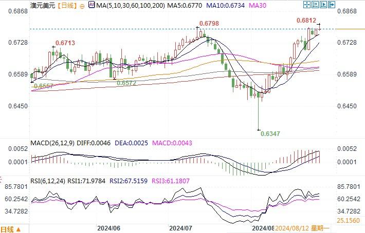 中国银行广东省分行王刚称,美国第二季度GDP初值、初请失业金以及美联储首选的PCE数据等数据出炉之前,美日预料将保持着窄幅的僵持走势状态,波动区间主要限于143-146之间。澳洲7月零售销售数据将于周五公布,将显示消费者在政府减税后是否增加了支出,从而可能加大通胀压力。对于澳元而言,关键风险在于周三7月通胀数据,如果超出预期,将有利于澳美冲破上方障碍0.68升向更高水平。