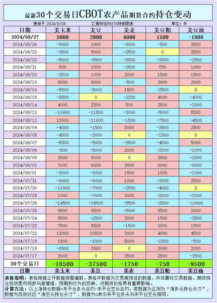 小麦市场在近期的交易中也面临压力。8月28日,小麦期货价格小幅下跌,全球充裕的供应对价格形成了压制。然而,在8月27日,基金增加了小麦的投机性净多头持仓,显示出市场的部分乐观情绪。