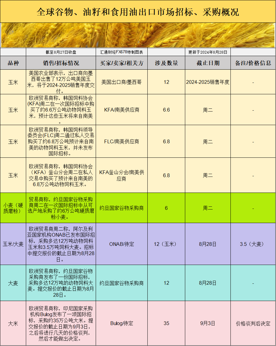 全球谷物、油籽和食用油出口市场招标、采购概况: