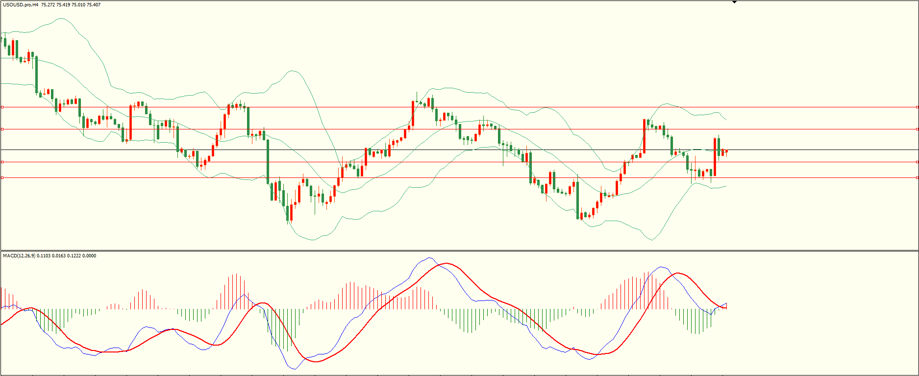 原油昨日回调至第一支撑上方展开反弹,至收盘触及第二阻力承压下行,日线报收上下影线中阳线,总体来看,短线的多空震荡尚未结束,从4H来看,布林上下轨略有收窄,MACD零轴附近运行,日内下方首要支撑74.60-70,第二支撑73.70-80,上方阻力76.60,77.80-90,保持在第一支撑上方短线有望测试第一阻力。