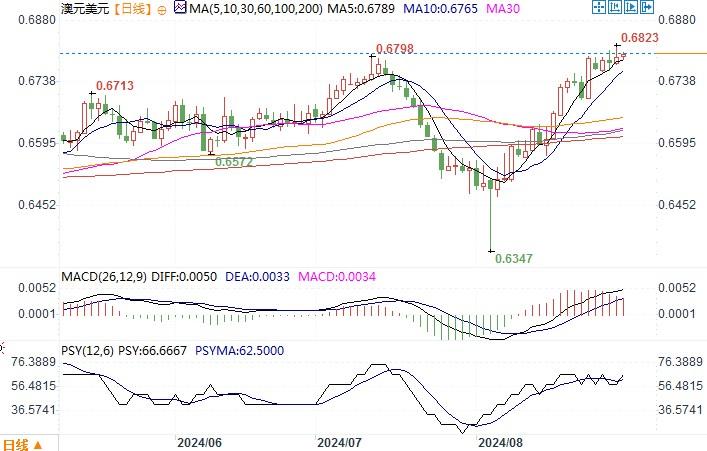 中国银行广东省分行王刚称,周五美日上涨 0.8%至146.09收盘,创两周来最大单日涨幅。7月美国PCE符合预期,支持了美联储下月可能降息25个基点,美元指数应声攀升至10日最高,盘尾上涨0.3%,报101.7。澳美下跌0.5%,收盘于0.6764。美国PCE提振美元指数出现反弹,从而压制了澳元的表现。