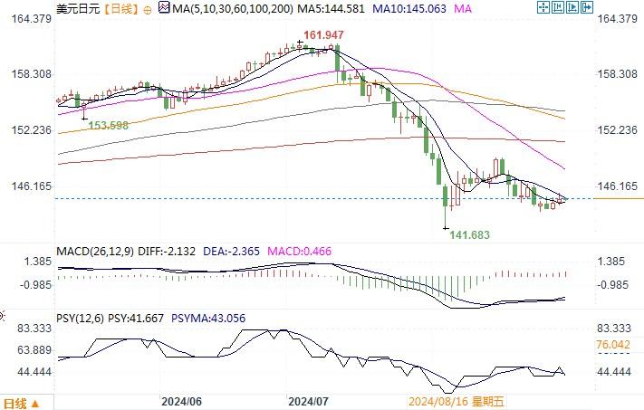 周五(8月30日),美元兑日元上涨 0.8%至146.09收盘,创两周来最大单日涨幅。美元兑日元当周累计上涨1.2%,创下6月中旬以来的最大单周涨幅。不过8月美元兑日元仍下跌2.6%,连续第二个月下跌。周五的数据显示,7月美国个人消费支出(PCE)物价指数环比上涨0.2%,符合预期,6月涨幅确认为0.1%。7月PCE物价指数同比上涨2.5%,与6月增幅持平。消费者支出在6月增长0.3%之后,7月增长0.5%。数据支持了美联储下月可能降息25个基点而不是50个基点的预期。为此,美元指数应声攀升至10日最高,盘尾上涨0.3%,报101.7。从日线图上观察,美元/日元汇价开始穿越布林带通道中轨线,MACD、RSI又开始上倾迹象,短线存在美元/日元有进一步反弹回升的趋向。但上方只要不穿越前期阻力149.50,则美元/日元整体下行的大趋势不至于发生扭转。