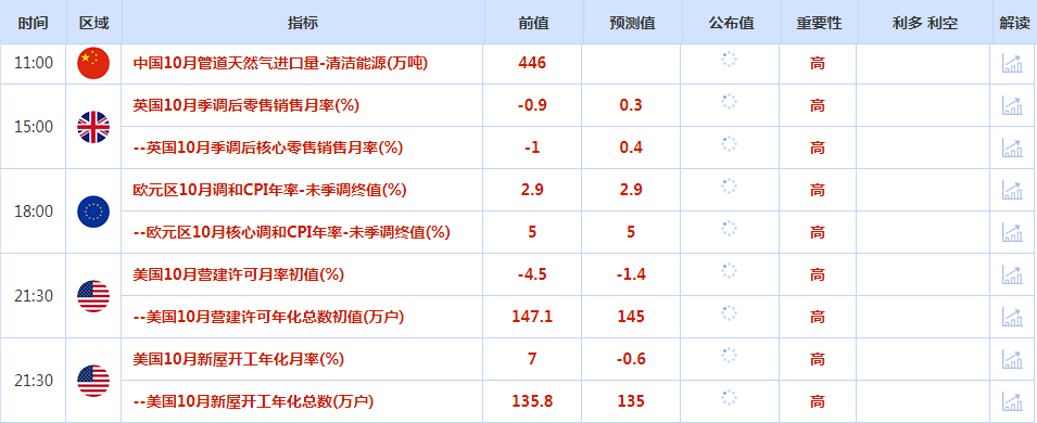周四(11月16日),10月份衡量批发价格的美国生产者价格指数下跌0.5%,这标志着自2020年4月以来的最大月度跌幅。与此同时,10月份消费者价格指数持平。对投资者来说,这可能是一个积极的信号,因为这可能减轻美联储对于通货膨胀的担忧。黄金、白银继续保持积极势头,而原油价格则大幅下挫。