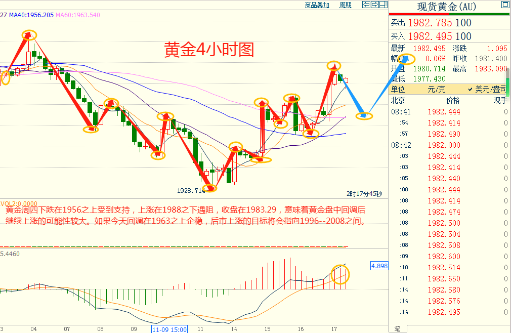黄金周四下跌在1956.00之上受到支持,上涨在1988.00之下遇阻,意味着黄金短线下跌后有可能保持上涨的走势。如果黄金今天下跌在1963.00之上企稳,后市上涨的目标将会指向1996.00--2008.00之间。今天黄金短线阻力在1995.00--1996.00,短线重要阻力2007.00--2008.00。今天黄金短线支持在1963.00--1964.00,短线重要支持在1944.00--1945.00。