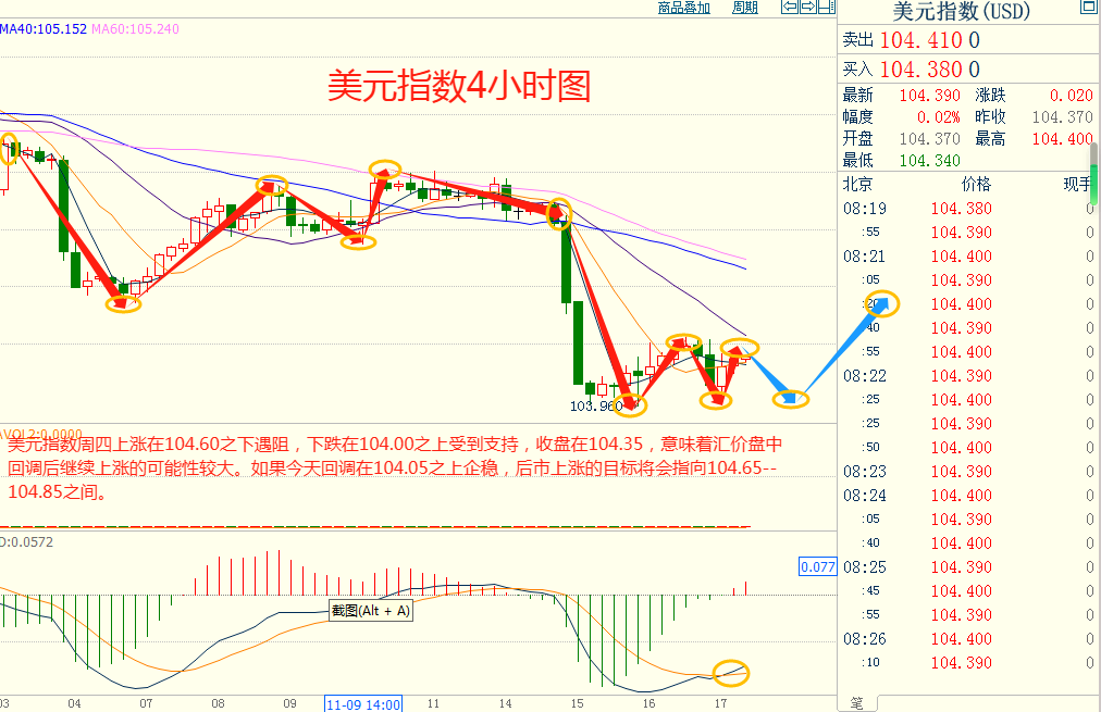 美指周四上涨在104.60之下遇阻,下跌在104.00之上受到支持,意味着美元短线下跌后有可能保持上涨的走势。如果美指今天下跌在104.05之上企稳,后市上涨的目标将会指向104.65--104.85之间。今天美指短线阻力在104.60--104.65,短线重要阻力在104.80--104.85。今天美指短线支持在104.05--104.10,短线重要支持在103.75--103.80。