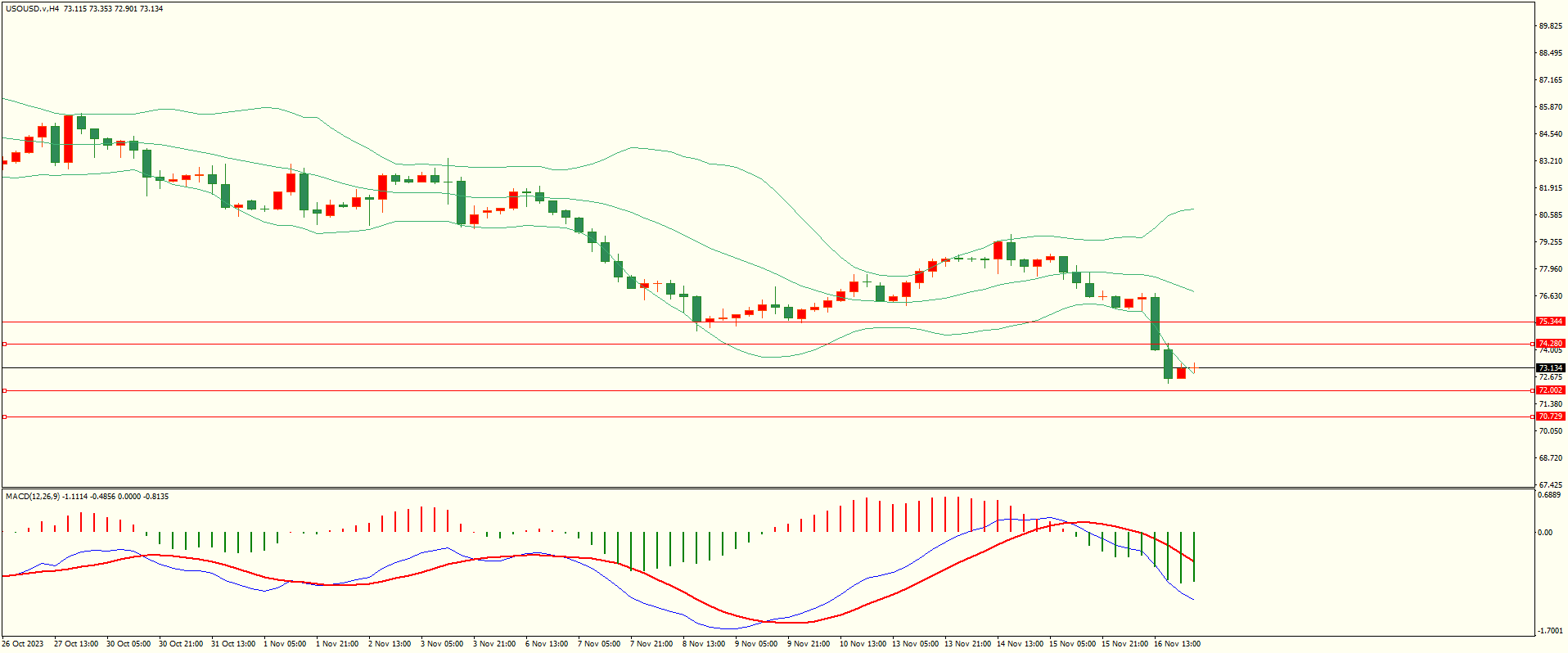 原油昨日反弹至第一阻力附近延续走低,纽约盘时段继续扩大跌幅,日线报收上下影线大阴线,空头动能继续增强,目前下方紧邻前期关键支撑区,下破后方可打开下行空间,从4H来看,布林中轨拐头向下,MACD零轴附近运行,日内上方首要阻力74.250,第二阻力75.35,下方支撑72.00,70.70-80,保持在第一阻力下方短线有望测试第一支撑。